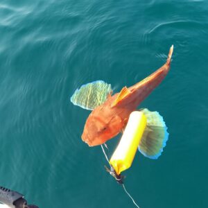 続いて、バイブレーションも試してみようと、テトラ脇を通してみると、まずまずサイズのカサゴさんがヒットしましたが、こちらの「引き」はさほどでもなく、ドラグ性能も作動しませんでした。