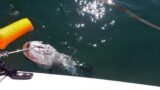 海中で力強く走り出すのを見て、ドラグ音が鳴り響くのを聞いて、竿先を海面に突き刺しながら必死にこらえ、少し巻き取っては寄せる、ということを6、7回ばかり繰り返します。