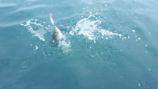 大潮の日曜日、皆さんたくさん釣れて楽しい思い出ができればいいなぁ♪と願いながら、テトラ釣り人から離れるようにやや沖に出てみると、海面がワチャワチャしています。